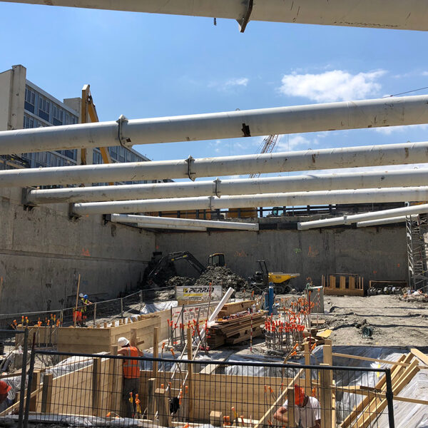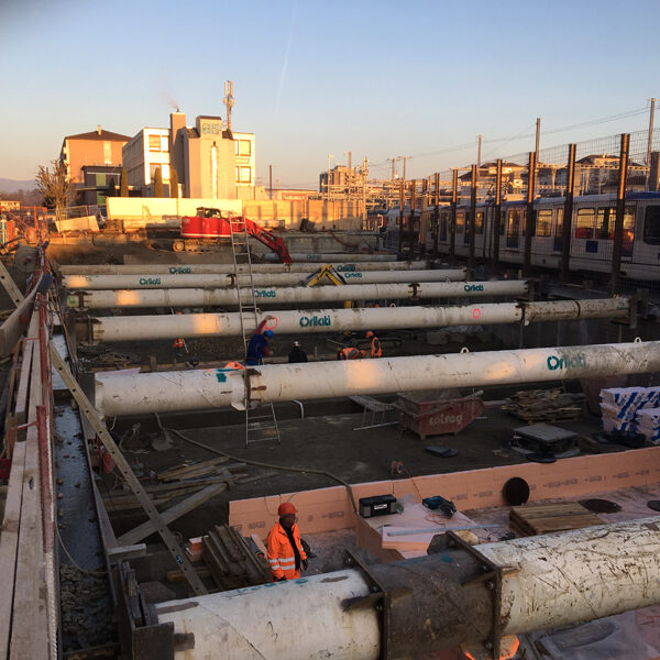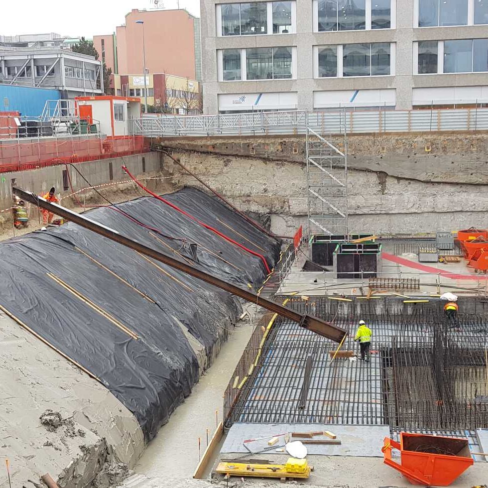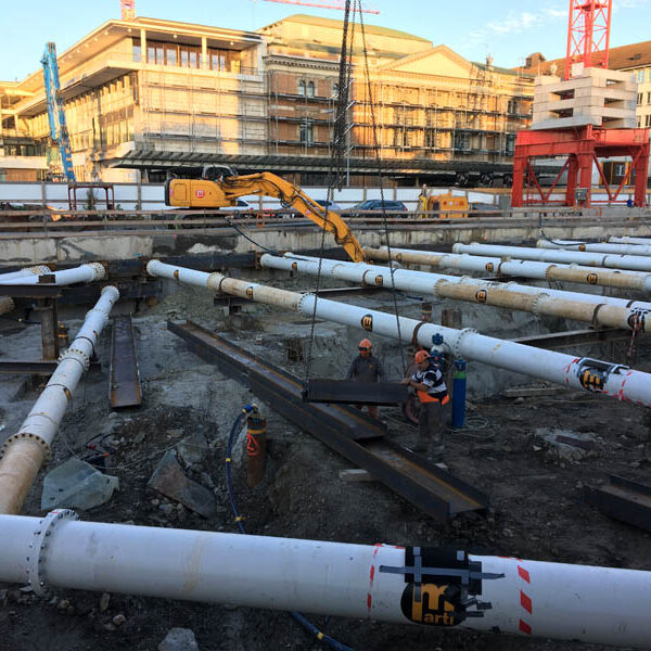 Concept et dimensionnement de l’étayage de fouille précontraint, établissement des plans et contrôles de l’exécution. Poids total environ 900 tonnes.