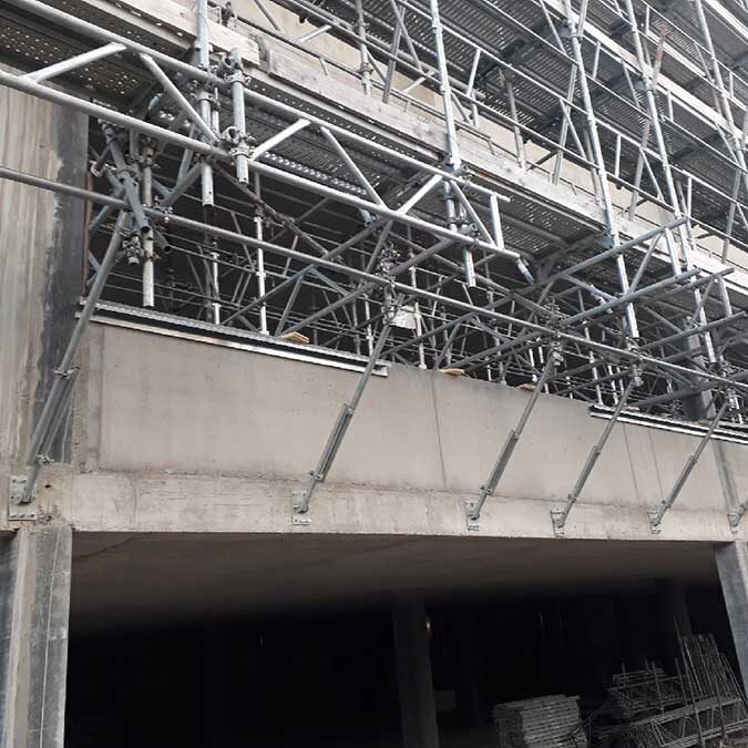 Appui d’un échafaudage haut de 38m sur des consoles porteuses ancrées chimiquement dans le parapet en béton.