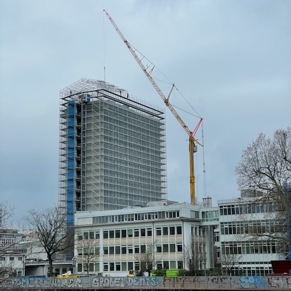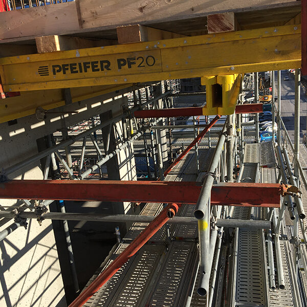 Dans le cadre d’une surélévation d’un immeuble, concept et vérification statique d’un échafaudage en porte-à-faux à une hauteur de 22m.