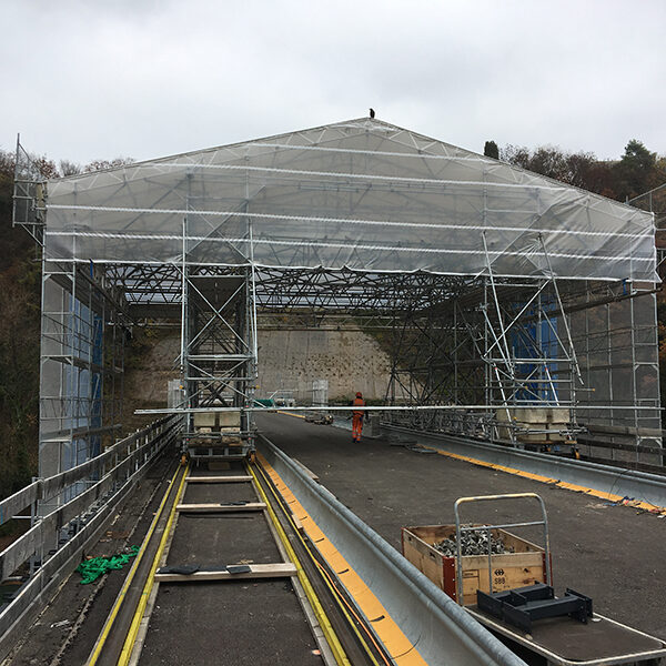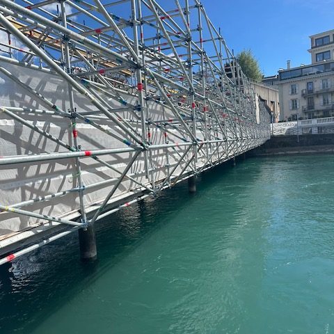 Concept et dimensionnement de la charpente métallique provisoire soutenant la passerelle piétons ainsi que les plateformes de travail. La charpente ne peut pas être ancrée dans l’ouvrage existant classé → tirants précontraints traversant les arches du pont. Total 70 tonnes.