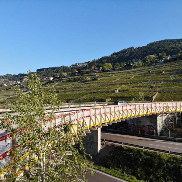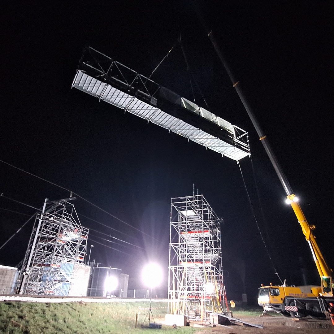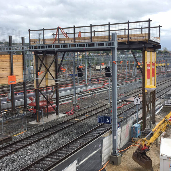 Portique de protection sur voie CFF pour permettre le passage avec la grue. Largeur 14.50m, hauteur 11.20m : concept, dimensionnement, note de calcul et réalisation des plans d’exécution.