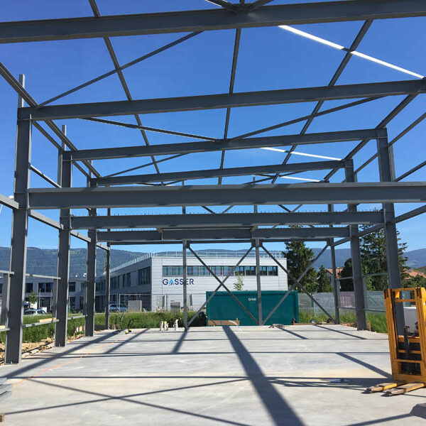 Halle métallique L=77m, B=13.50m, H=9m. Concept et dimensionnement de la charpente métallique, établissement des plans et contrôles de l’exécution. Poids total environ 60 tonnes