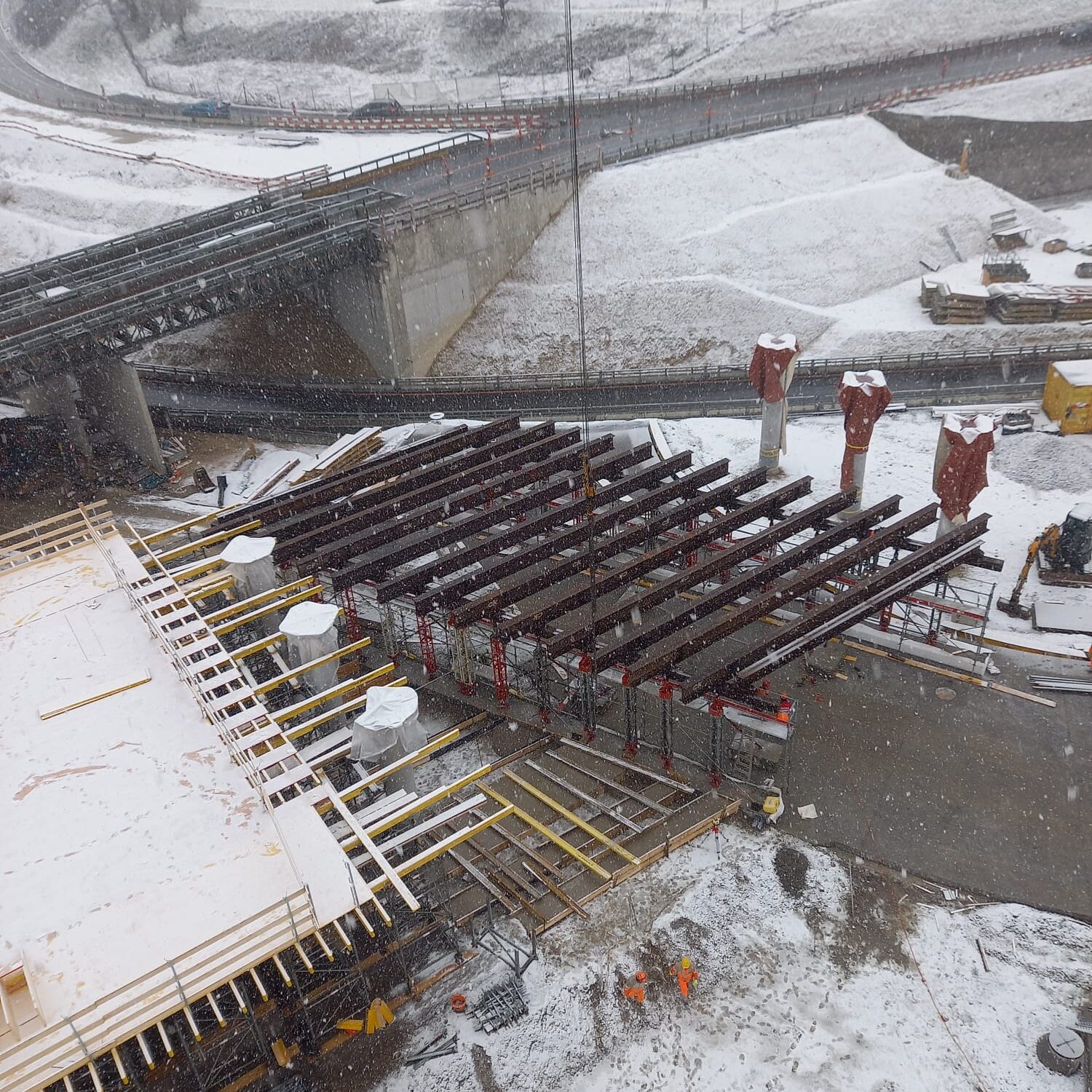 Réalisation d’un rond-point par-dessus l’autoroute : dimensionnement des plateformes suspendues au caisson métallique pour le bétonnage du tablier.