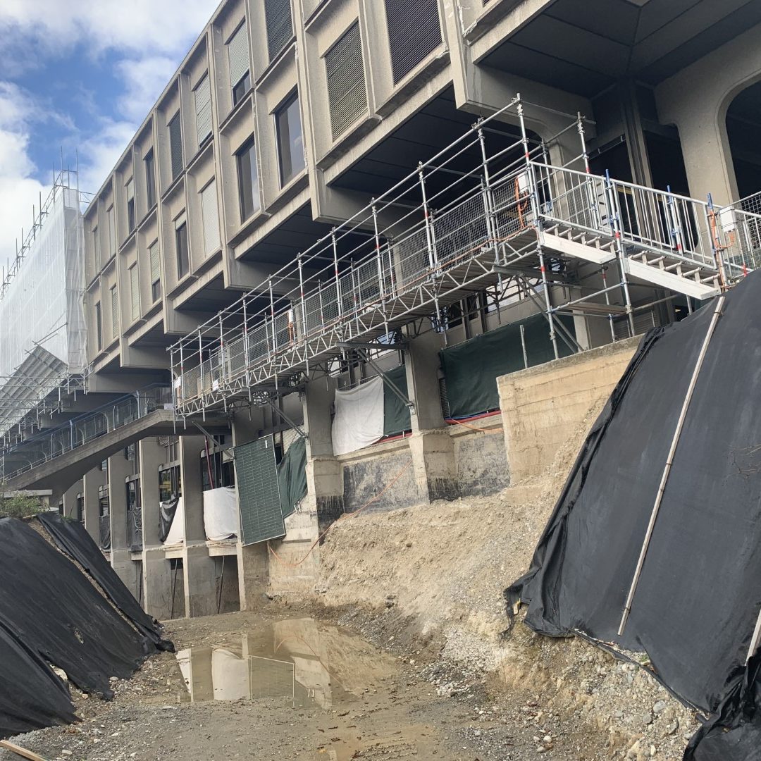 Toiture provisoire avec échafaudages sans ancrages possibles dans les façades : concept et vérification statique.