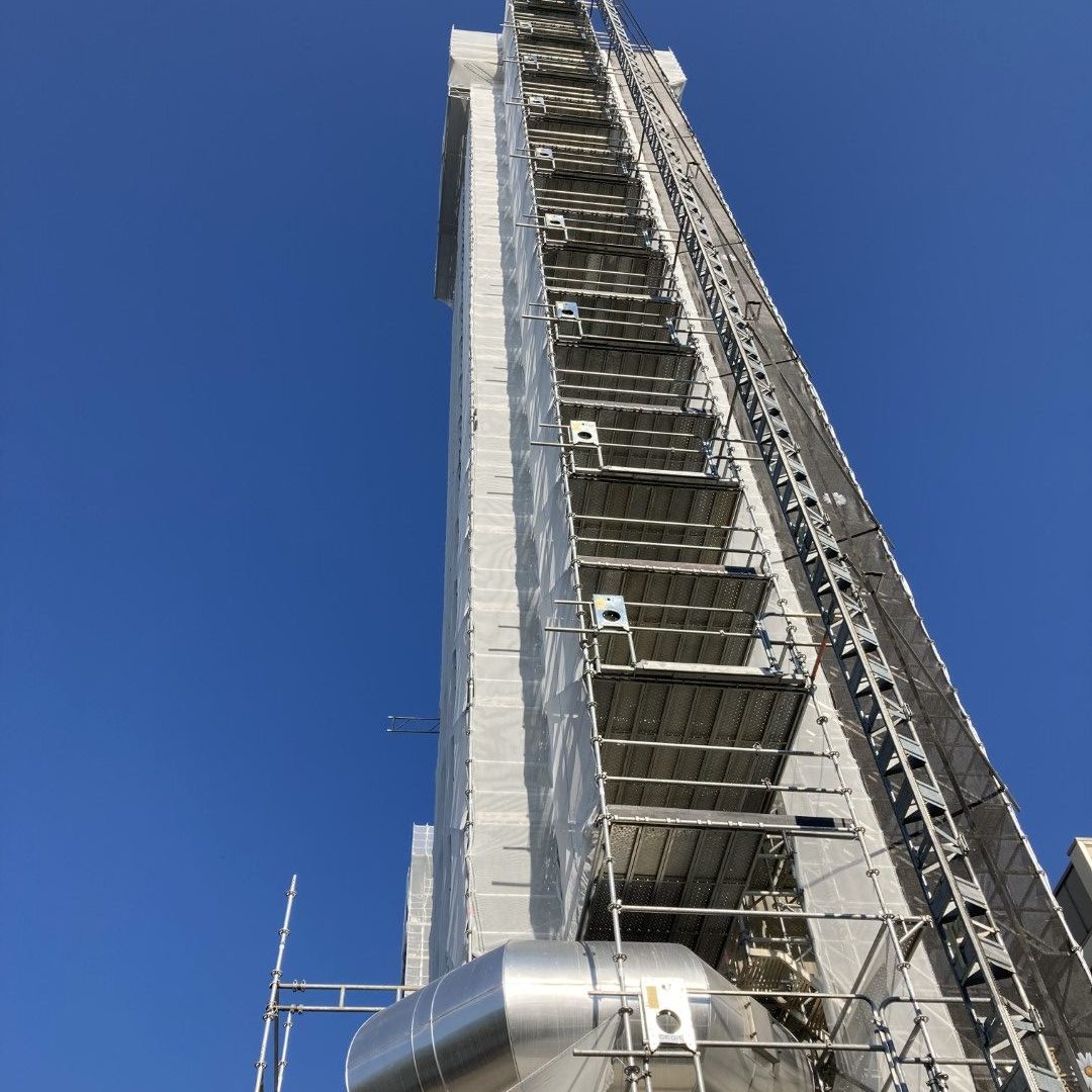 Concept et vérification d’un échafaudage de façade sans contreventements. Hauteur totale, y compris surélévation : H=31m, L=87m