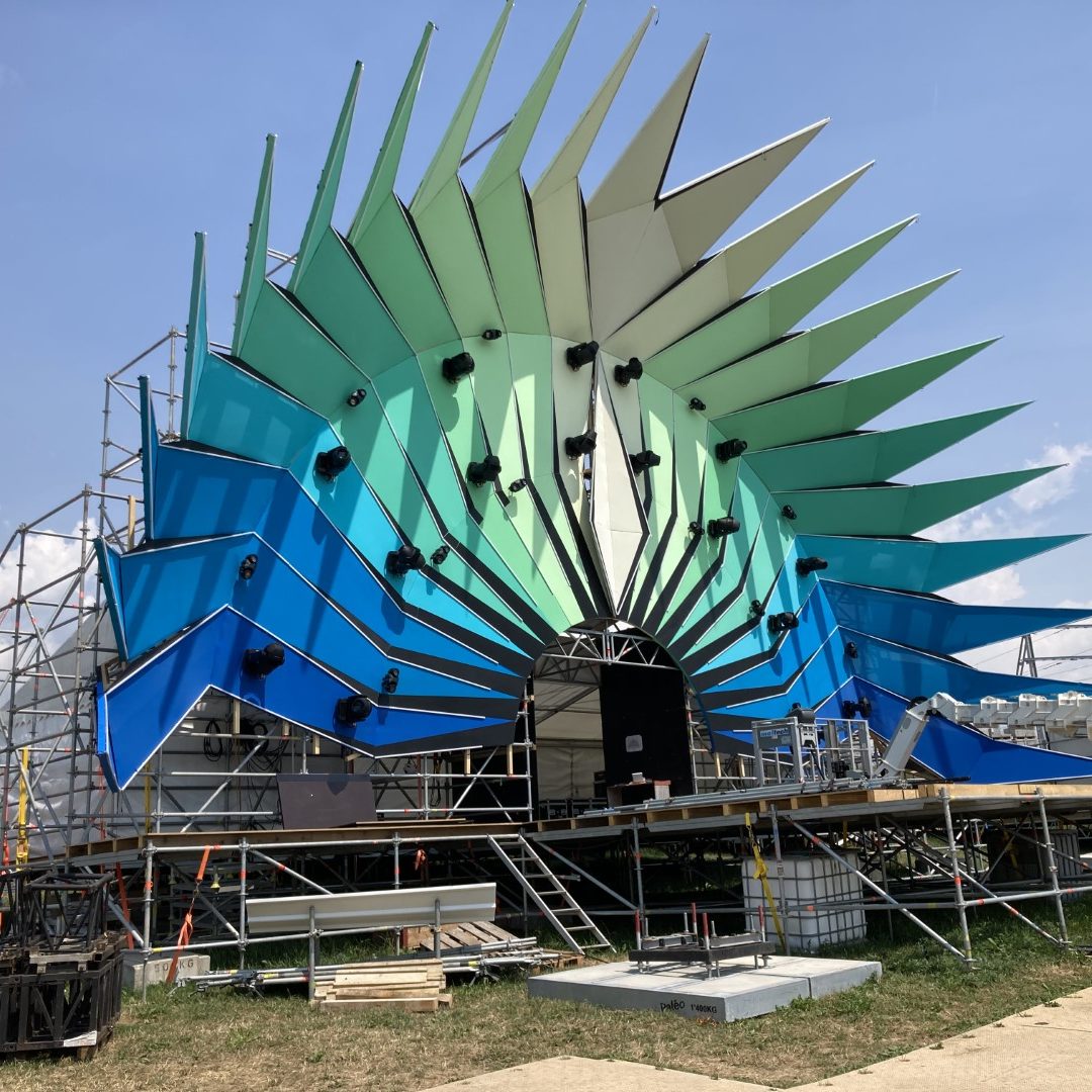 Vérification de la structure multidirectionnelle de type Layher composant la scène ainsi que la corolle à l’arrière. Calcul des ancrages et des lests nécessaires afin de garantir la stabilité de la structure.