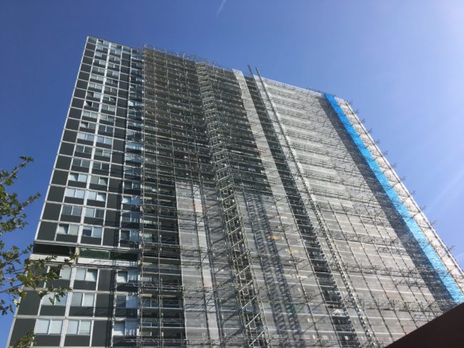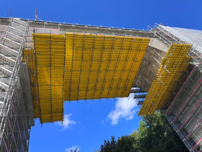 Appui d’un échafaudage haut de 38m sur des consoles porteuses ancrées chimiquement dans le parapet en béton.