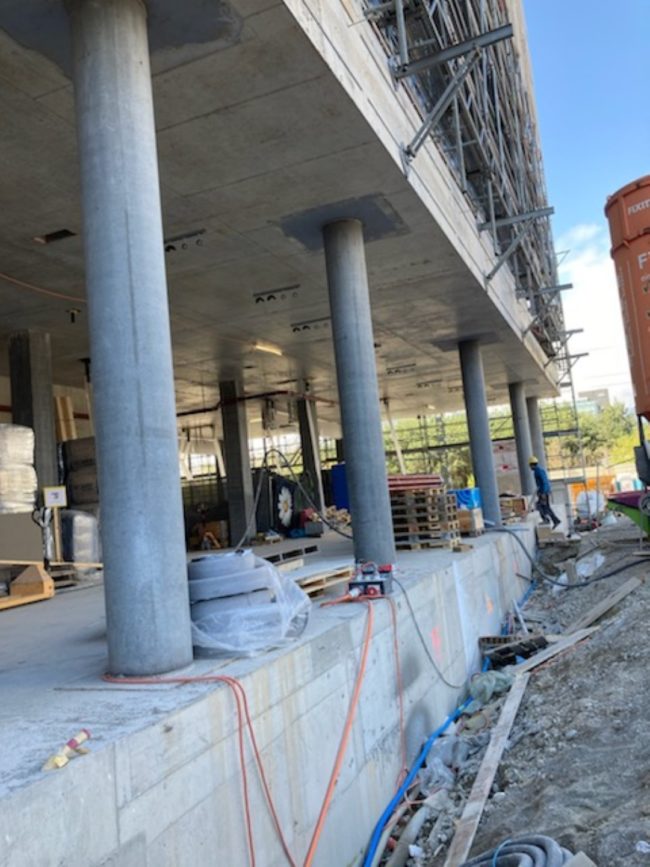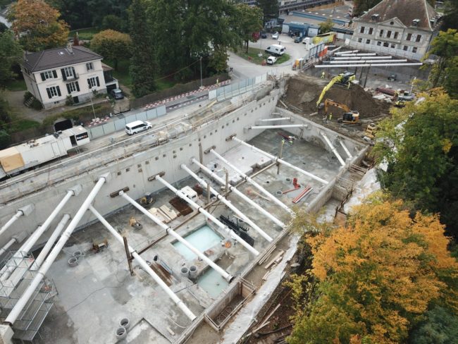 Concept et dimensionnement de l’étayage de fouille précontraint et établissement des plans. Environ 100 tonnes d’acier.