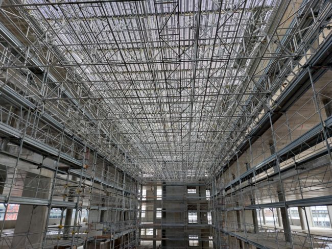 Concept et vérification statique d’une plateforme de travail en haut de l’atrium : dimensions 42.60 x 12.90m à une hauteur de 27m.
