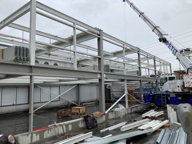 Halle métallique pour la nouvelle boulangerie L=38.20m, B=9.65m, H=6.60m, avec dalle mixte intermédiaire. Concept, dimensionnement et établissement des plans d’ensemble, y compris détails-type et liste d’acier.
