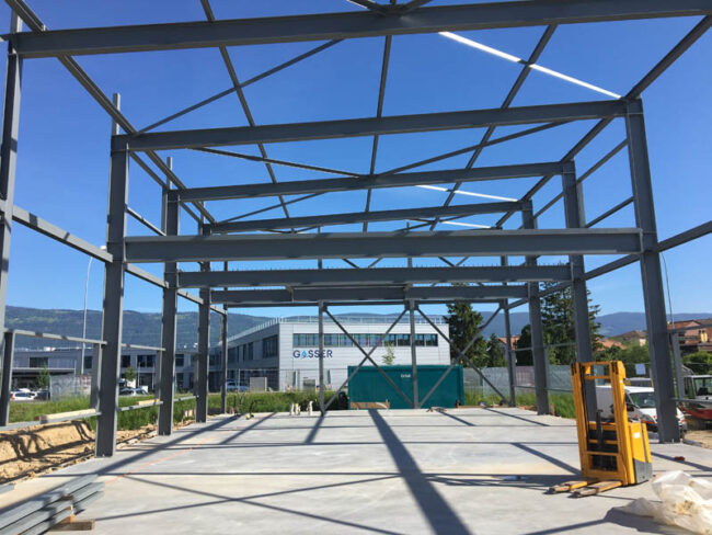 Halle métallique L=77m, B=13.50m, H=9m. Concept et dimensionnement de la charpente métallique, établissement des plans et contrôles de l’exécution. Poids total environ 60 tonnes