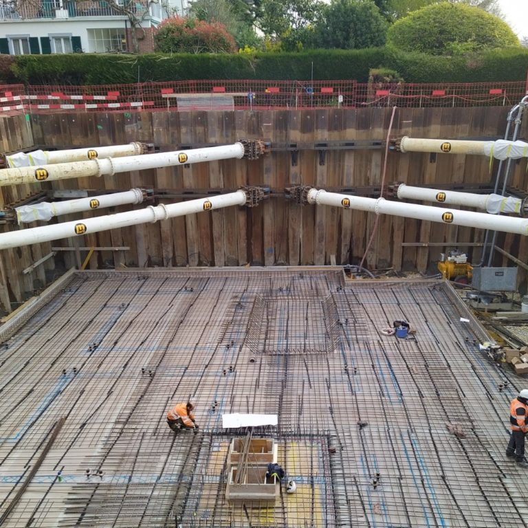 Concept et dimensionnement de l’étayage de fouille, établissement des plans et suivi des travaux de montage.