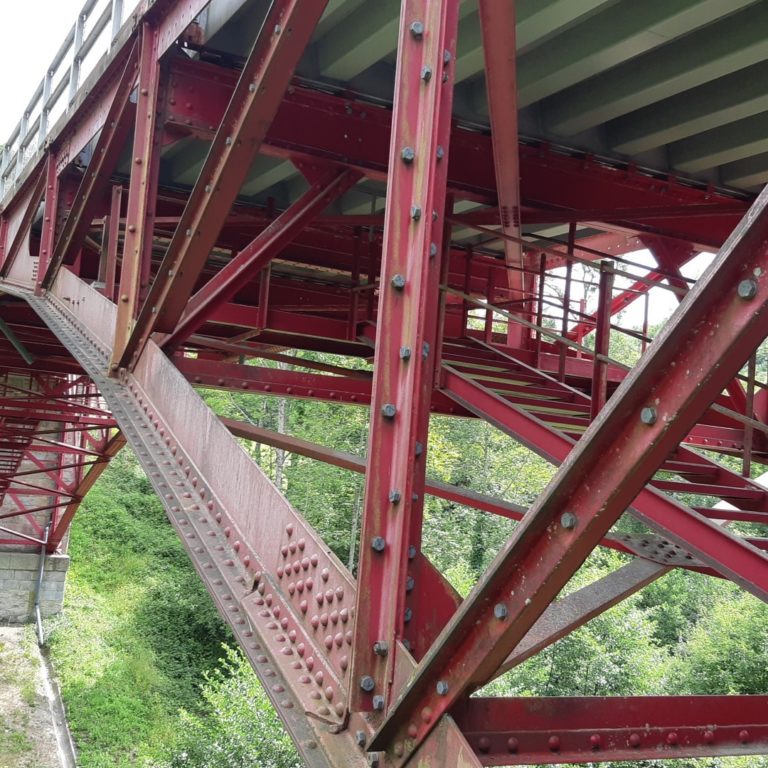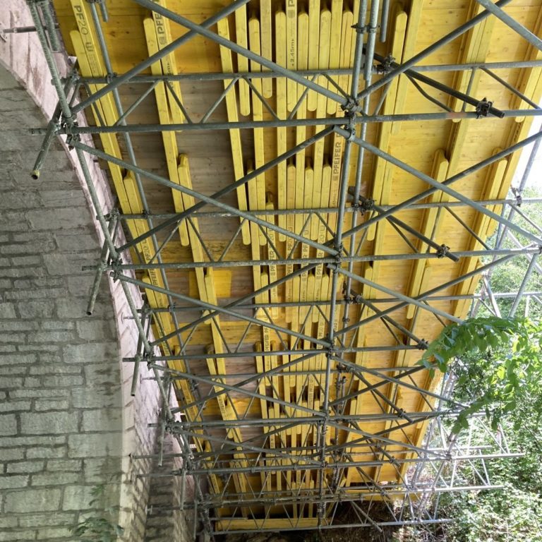 Concept et dimensionnement de la charpente métallique provisoire soutenant la passerelle piétons ainsi que les plateformes de travail. La charpente ne peut pas être ancrée dans l’ouvrage existant classé → tirants précontraints traversant les arches du pont. Total 70 tonnes.