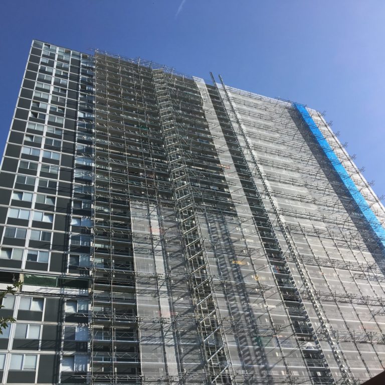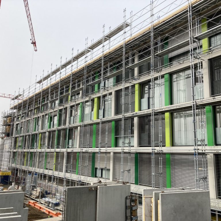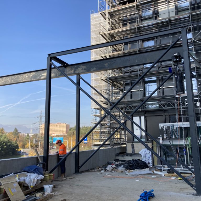 Dans le cadre d’une surélévation d’un immeuble, concept et vérification statique d’un échafaudage en porte-à-faux à une hauteur de 22m.