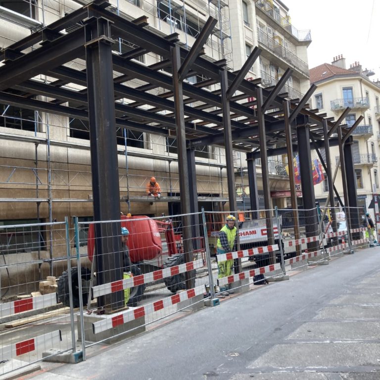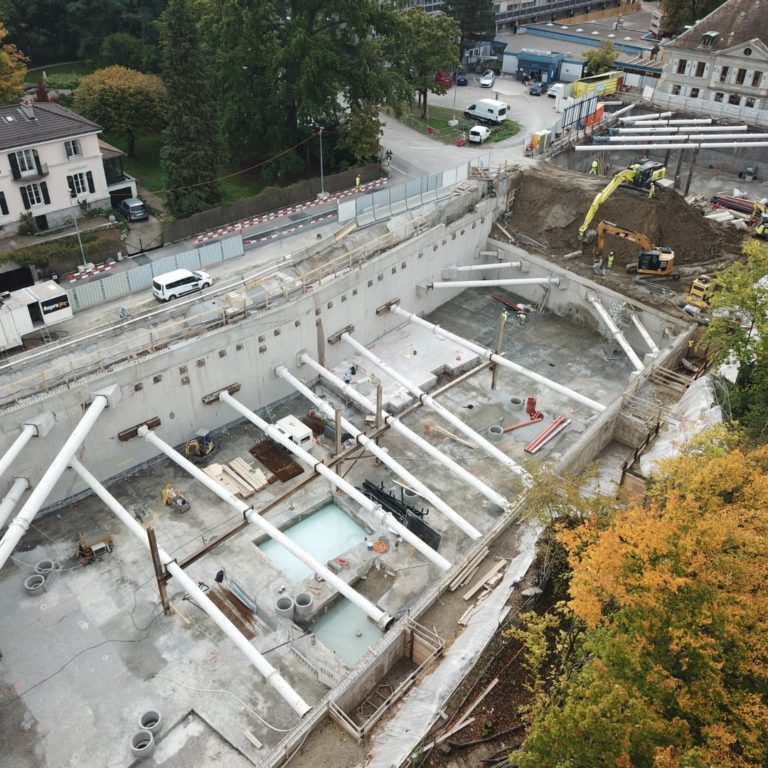 Concept et dimensionnement de l’étayage de fouille précontraint, établissement des plans et contrôles de l’exécution. Poids total environ 900 tonnes.