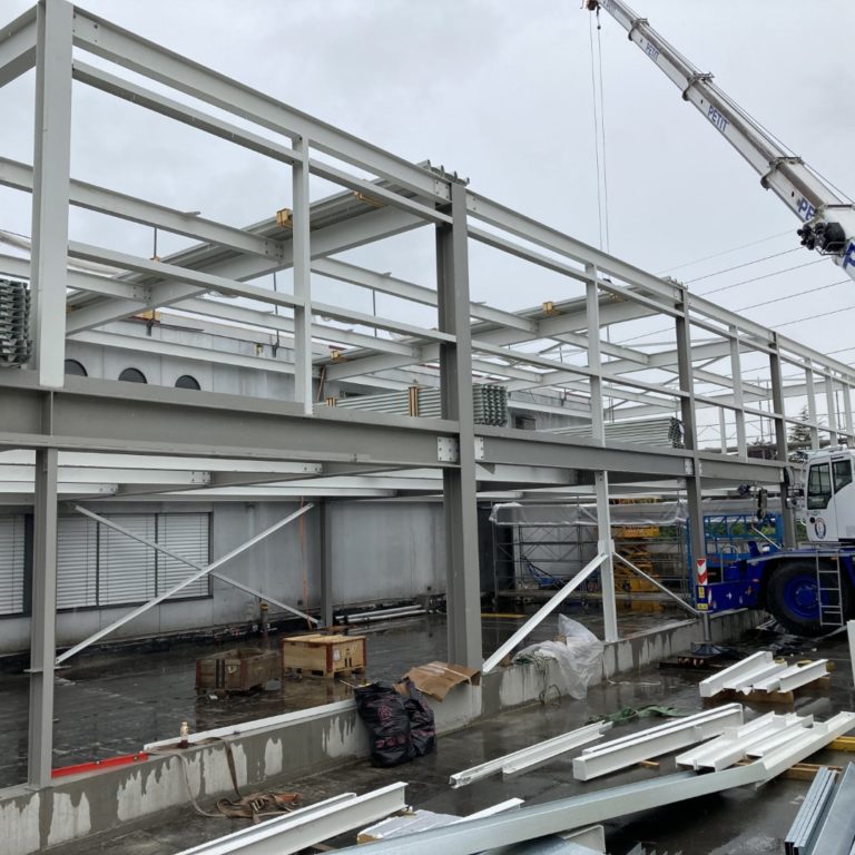 Halle métallique pour la nouvelle boulangerie L=38.20m, B=9.65m, H=6.60m, avec dalle mixte intermédiaire. Concept, dimensionnement et établissement des plans d’ensemble, y compris détails-type et liste d’acier.