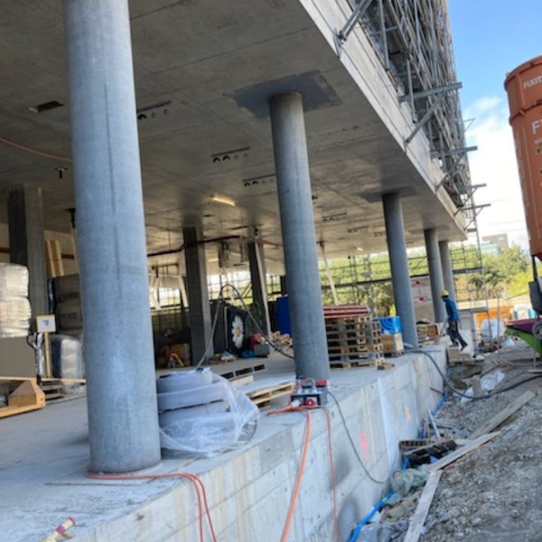 Etayage de fouille pour retenir une paroi de pieux sécants. Profondeur de la fouille 20.50m. Tonnage de l’étayage 162 tonnes. Précontrainte de 1500 à 3500 kN. Etablissement du concept, dimensionnement des étais, longrines, filières, chandelles et tous les détails.