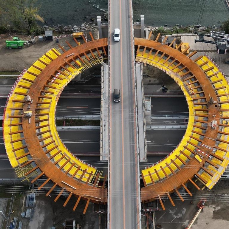 Réalisation d’un rond-point par-dessus l’autoroute : dimensionnement des plateformes suspendues au caisson métallique pour le bétonnage du tablier.