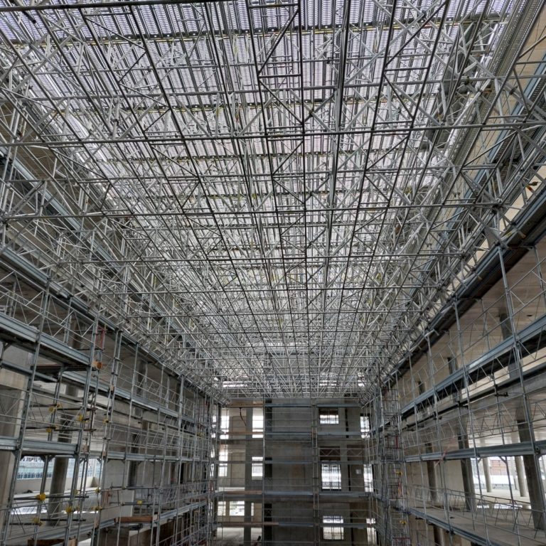 Toiture provisoire avec échafaudages sans ancrages possibles dans les façades : concept et vérification statique.