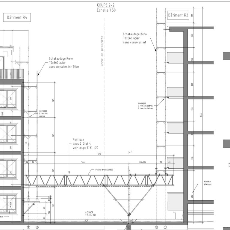 Echafaudage haut de 18m suspendu au moyen de poutres-treillis ck800 : concept, dimensionnement et établissement des plans d’exécution.